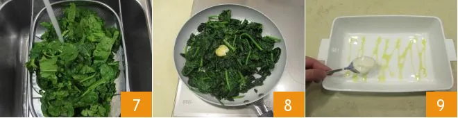 Rinse the spinach to remove soil residues 7 and then place them in a pan where you have browned the garlic with the oil 8, cooking over high heat for a few minutes, just enough to soften them slightly. Now that you have all the ingredients ready, you can proceed to assemble the lasagna. Grease a 12x8 inch rectangular baking dish with a little oil and then pour some béchamel sauce 9. This will create a base that will prevent the pasta from sticking to the bottom.