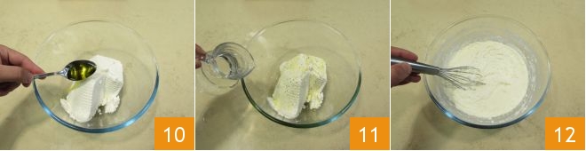 Once the nettles are prepared, proceed with making the ricotta cream. Pour the ricotta into a bowl, add the oil 10, salt, a pinch of black pepper, and water 11; then using a whisk, beat everything until you get a homogeneous cream 12.
