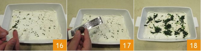 Grease the bottom of an 8x12 inch pan, spread a layer of ricotta cream 13 and place a first layer of lasagna sheets 14 to cover the entire surface. Add more ricotta cream 15,