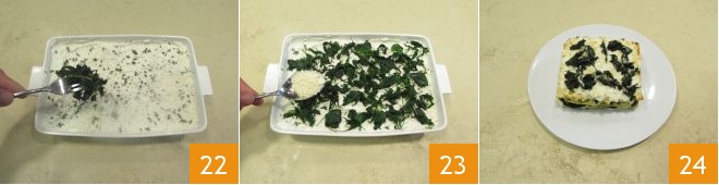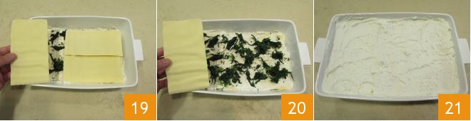 Cover with another sheet 19 and proceed in this way, alternating lasagna with ricotta and nettles, for 2 more layers 20. Cover the last layer of pasta with ricotta cream 21,