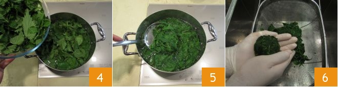 At this point, to neutralize their stinging power, blanch the nettles in boiling water 4, slightly salted. After a few minutes, drain them 5 and squeeze them with your hands 6.