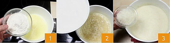 To prepare asparagus and raspadura lasagna, first Béchamel sauce; melt the butter and sift the flour slowly to create the roux 1, stirring with a whisk. Add the slightly warm milk and stir until it thickens 2; add salt and season with nutmeg. At the end of the preparation, off the heat, incorporate the pecorino cheese and mix well 3.