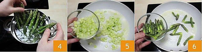 Clean the asparagus, then cook them in boiling water (it should simmer gently) in the appropriate asparagus pot, leaving the tips out to steam; the asparagus should cook but remain crunchy 4. Drain the asparagus well: cut the tips (about 2 inches in length) and slice the stalks into rounds. Put 1 oz of butter to melt in a pan and sauté the asparagus stalks with a pinch of salt (a couple of minutes will suffice) 5; this way, they will dry from any residual cooking water and, at the same time, gain flavor. Do the same thing in another pan with the asparagus tips, making sure they don't crumble 6.