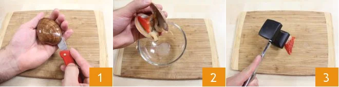 To prepare clam lasagna, first take care of cleaning the clams. Open them by running the blade between the shells 1, collect the water contained in the shell in a small bowl 2, and collect the flesh. Place it on a cutting board and, with a meat tenderizer, pound each clam, focusing on the tougher, calloused foot (the red part), until it softens 3.