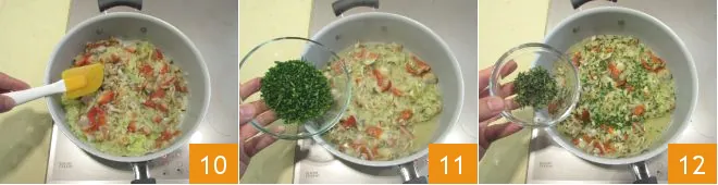 Cook them for 2 minutes over high heat 10, just long enough to evaporate the excess liquid. Also add half of the chopped chives 13, half of the thyme 12, and cook for another couple of minutes.