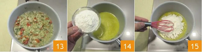 Stir, turn off the heat, and set aside 13. Now focus on the béchamel: start with the roux; in a saucepan, melt the butter, turn off the heat momentarily, and add the flour 14, stirring vigorously to avoid lumps 15. Return to low heat.