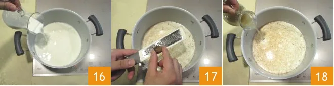 In another saucepan, pour the milk 16 and add the nutmeg 17 and 150 ml (5 oz) of the remaining clam water 18, bring to just below boiling over low heat,