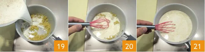 and gradually pour it over the butter and flour roux 19, which in the meantime will have thickened over low heat, turning a hazelnut color. Stir very vigorously with a whisk 20, continuing until, after 5-6 minutes, the béchamel thickens 21.