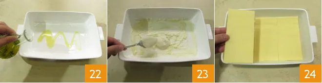 You can now assemble your lasagna: grease a 12x8 inch baking dish with a little oil (2 tsp) 22 and then smear a few tablespoons of béchamel on the bottom 23, spreading it evenly. Now lay the first layer of egg lasagna sheets on the bed of béchamel 34, placing them side by side.