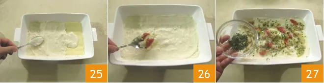 Now continue spreading a thin layer of béchamel over the egg lasagna sheets 25, then sprinkling with clams 26 and adding a sprinkle of the remaining thyme and chopped chives 27.