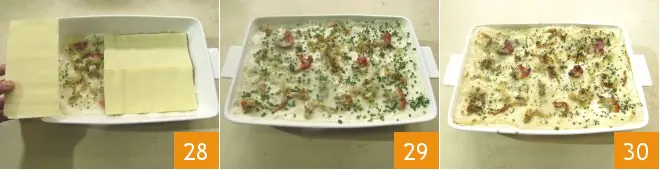 Then cover with more sheets of lasagna 28 and continue in the same way until you have used up the ingredients, finishing with an uncovered layer 29. Your lasagna is ready to be baked for 20 minutes in a preheated static oven at 356°F. Finally, finish the cooking with another 5 minutes in grill mode, and your clam lasagna is ready to enjoy 30!