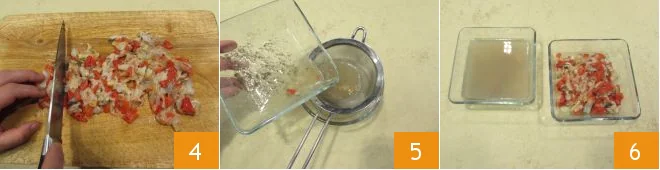 Roughly chop the clams 4, strain the collected liquid through a fine mesh sieve 5, and keep the water and flesh separate 6: note that you will need 30 ml (1 oz) of juice to cook the clams and 150 ml (5 oz) to make the béchamel.