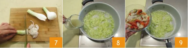 Clean and wash the scallions, then cut them in half lengthwise, and then into thin slices 7. Brown the peeled garlic clove in a saucepan with about 2 tbsp of oil, and once it has flavored, remove the clove and let the scallions wilt over low heat for about 15 minutes, deglazing with 1 oz of the reserved clam juice 8. Then add the clams 9.