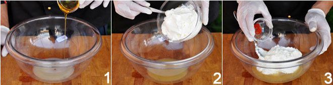 PREPARATION OF THE MEAT AND MARINADE First, proceed with preparing the marinade. The marinade ingredients are 5 parts yogurt, 2 parts lime juice, 1 part chestnut honey for one sachet of saffron. Take a large non-reactive bowl (glass or pyrex) and pour the lime juice, just warmed over the fire, to dissolve the honey 1. Once well dissolved, add the yogurt 2 and the saffron 3, taking care to mix everything well 4.