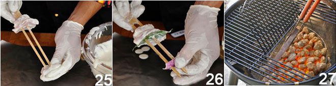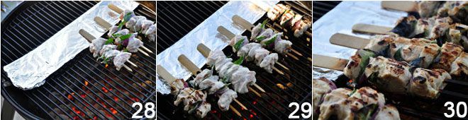 THE COOKING OF THE SHISH TAOUK Once the dips are prepared, you can proceed with preparing the skewers. It is preferable to use good quality steel skewers, wooden skewers, or bamboo skewers carved into a fork. The latter are recommended as single ones, in the presence of fatty liquids, tend to rotate the meat on itself when attempting to turn them to cook them on the other side. If bamboo skewers are not available, two parallel skewers can be used instead to allow the kebab to be turned more easily. In any case, if using wooden skewers, it is advisable to soak them for some time to prevent them from catching fire during cooking. Start by removing excess marinade and alternate the meat cubes, onion slices, and a bay leaf on the skewer (25-26). In this way, each piece of meat will have one side in contact with the onion and the other with the bay leaf. The heat will release essential oils that will flavor the cube. Once all the skewers are complete, place them on the grill 27.