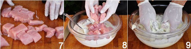 Place the cubes in the marinade 8, massage them for a few seconds 9, cover with plastic wrap, and refrigerate for at least 1 hour.