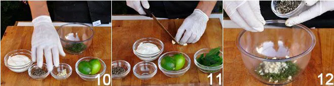 THE LABNEH To prepare the labneh 10, puree the garlic 11 and combine it with chopped fresh mint, salt and pepper 12, and yogurt 13,