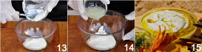lime juice 14, then mix vigorously. Place the labneh in a small bowl and cover the surface with a thin layer of extra virgin olive oil 15, which will add flavor and delay oxidation. Refrigerate the labneh and let it rest.