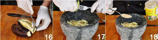 THE BABA GANOUSH (MUTABBEL) To prepare the baba ganoush (or muttabel), roast the eggplant over the fire until the outside is completely charred and the inside is soft and yielding. Split it in half and scoop out the flesh with a spoon 16, being careful not to scrape too much of the charred parts. Place the flesh in a mortar if you wish to grind it by hand or in a glass to use an immersion blender. Add lime juice 17, a generous amount of tahini 18 along with a splash of extra virgin olive oil,