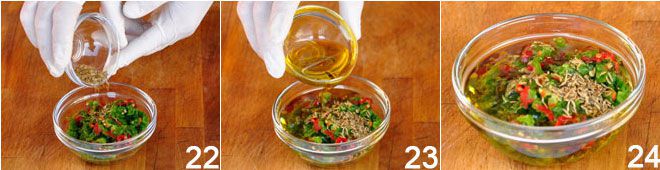 THE MUHAMMARA Finely chop the sweet and spicy peppers, being careful not to reduce them to mush, as the seeds and skin will add a rustic note. Add cumin 22, just a bit of salt, lime juice, oil 23, and mix vigorously 34.