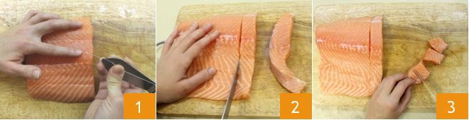 To prepare the leek and potato cream with salmon skewer, start by deboning the salmon slice. Use tweezers to remove the bones along the back 1. Once this is done, feel the meat again to ensure all bones are removed. Then cut out 4 slices 2 and from these cut 4 regular cubes 3.