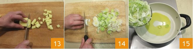 Cut the potatoes in half, then into strips, and finally into rather small cubes 13. Trim the leeks by removing the ends and cutting them into rings 14. Then heat a drizzle of oil in a large pot and sauté the leeks 15.