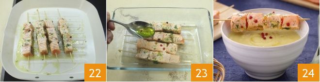 When the meat is slightly pink 22, you can turn off the heat and drizzle them with the same emulsion in which they marinated 23. At this point, all you have to do is pour the leek and potato cream into bowls and accompany each bowl with a salmon skewer 34!
