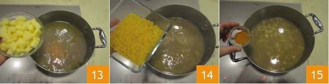 Then drain and add the potatoes as well 13. Cook for another 25 minutes or so. Adjust the amount of water or broth by adding more if it has evaporated excessively, season with the rosemary sprig and add the pasta to the pot 14. Cook for a few minutes, keeping the pasta very al dente, and lastly add the turmeric 15,