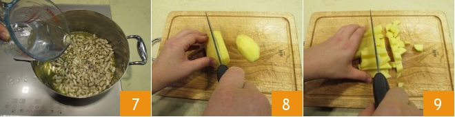 Cover with about 6 cups of hot water (or broth) 7 and salt. Let it cook for about 50 minutes. Meanwhile, cut the potatoes first into slices 8 and then into rather large cubes 9.