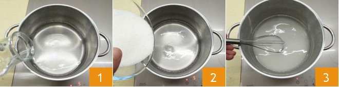 To prepare the granita, pour water 1 and sugar into a saucepan 2. Give it a stir with the whisk 3 and turn on the heat, the flame should be lively.