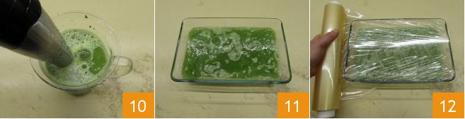You should obtain a bright green liquid mixture, without visible pieces of basil 10. Pour the mixture into a shallow and wide baking dish 11, cover with plastic wrap 12 and place in the freezer.