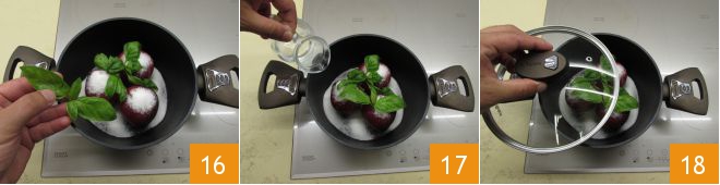and cover them with basil leaves 16. Add a little water 17 to create some steam inside the saucepan. Cover with a lid 18 and cook for 35-45 minutes depending on the size of the peaches, over a lively flame.