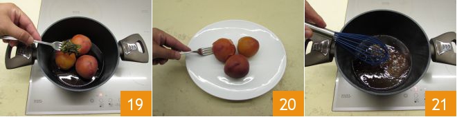 As soon as they are ready, turn off the heat. Remove the basil 19 and gently transfer only the peaches to a plate 20. Put the saucepan back on the heat 21