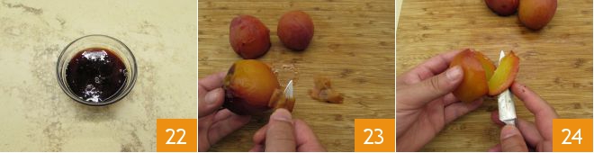 and as soon as the cooking syrup is reduced, transfer it to a small bowl 22 and let it cool. As soon as the peaches have cooled, peel them using a small knife 23. Be careful to remove only the skin without affecting the fruit's flesh. As you go, place them on a cutting board and continue peeling the others. Now from each peach, cut slices 34.