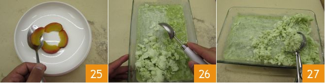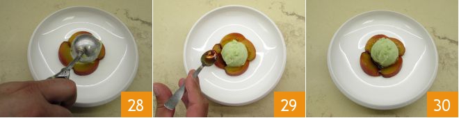 At this point, everything is ready, you just need to plate. With a spoon, transfer 4 peach slices to the edge of the plate 25. Then, using a scoop without a spring or a spoon, scrape the granita 26. Gather it with the scoop, this time with a spring, and create a semi-sphere of granita 27,