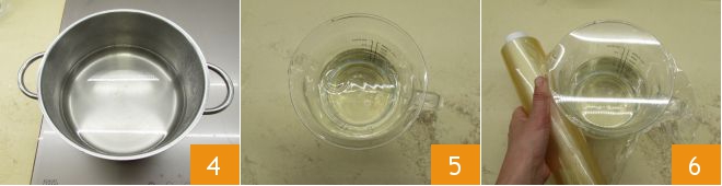 Bring the syrup to a boil and let it cook for a couple of minutes, stirring occasionally with a whisk. When the sugar is well dissolved, turn off the heat 4 and let the syrup cool to room temperature. Transfer it to a tall container 5, cover with plastic wrap 6 and place in the refrigerator until it is completely cold.
