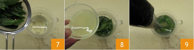 At this point, quickly wash the basil and squeeze the lemons to obtain 120 g of juice, to be filtered. Take the cold syrup, add the basil 7, the lemon juice 8 and blend everything with an immersion blender for 1-2 minutes 9.