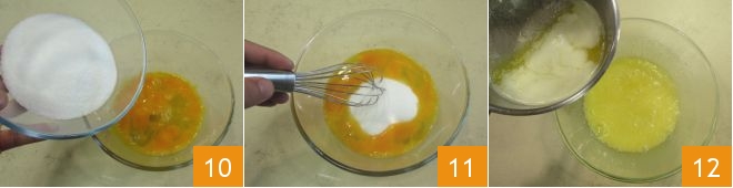 Separately, pour the 6 eggs into a bowl along with the sugar 10 and work everything with a whisk 11; then add the now cooled butter 12