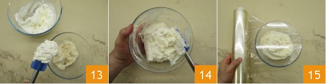 and when it’s firm, pour half of it into the bowl with the mascarpone and mix well 13. Then add the remaining part by folding it in from bottom to top 14. Put the cream in the fridge, covering with plastic wrap, and move on to the ladyfingers 15.
