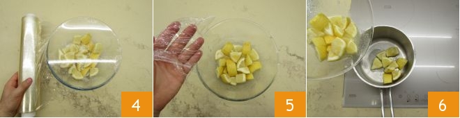 and cover with plastic wrap, letting it macerate for about half an hour at room temperature 4. Once the lemons have released some liquid 5, transfer the whole mixture to a steel saucepan 6