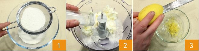 To make the lemon cookies, start by preparing the shortcrust pastry (for further details, refer to the Shortcrust pastry recipe): sift the flour 1 and transfer it to the mixer, add the butter and a pinch of salt 2 and blend until you get a sandy mixture; separately grate the lemon zest 3.