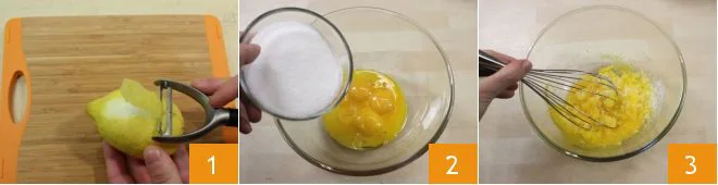 To prepare the lemon cream, peel the lemons, being careful not to take the white part 1 (you can leave half a lemon aside to grate some zest at the end of cooking the cream) and add the zest to a saucepan where you have added the milk. Turn on the low heat and let the milk warm (it should not reach boiling). Meanwhile, in a bowl, place the egg yolks and sugar 2 and whisk them together 3.