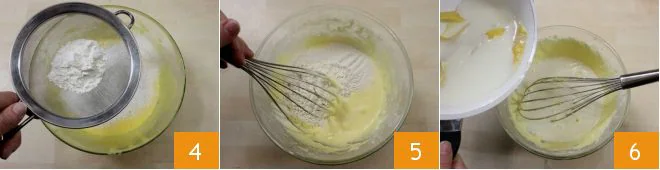 You will need to obtain a smooth cream before adding the sifted flour and cornstarch 4; mix with the whisk to combine the powders 5, then add the warmed milk 6.