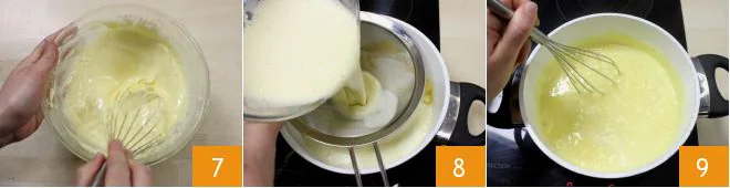 Mix vigorously to obtain a smooth and fluid mixture 7, then pour it back into the saucepan, straining it with a fine-mesh sieve to avoid lumps 8. Turn on the low heat and cook the cream, stirring continuously with the whisks 9 until it thickens (this will take about 15 minutes).