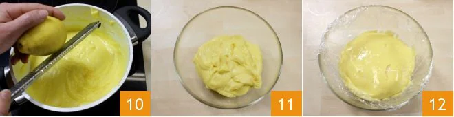 When it has thickened, before turning off the heat, you can grate some lemon zest if you prefer to enhance the flavor 10; then turn off the heat and transfer the cream to a bowl 11, cover it with cling film in contact 12, and let it cool before placing it in the refrigerator to use it!