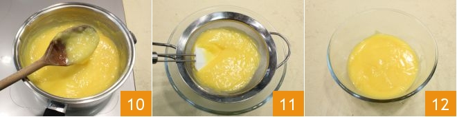 To know when the cream is ready, just dip a wooden spoon into it 10; when you see that the cream no longer slides off, it is time to turn off the heat. Now take a very fine-mesh sieve and strain the cream to remove the lemon peel and any lumps 11, your lemon curd is ready 12 to fill your desserts.