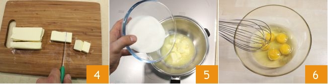 Cut the butter into pieces 4, place it in a double-bottomed saucepan for a bain-marie, and melt it over low heat, then add the sugar 5 and stir with a spoon. Separately, beat the eggs with a whisk 6.