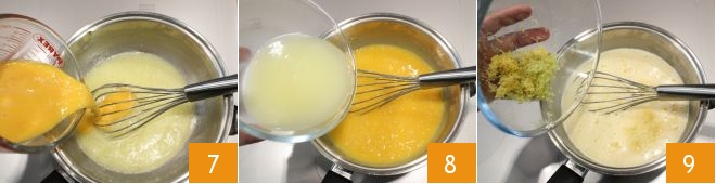 Pour them into the cream 7 while continuing to mix, also add the lemon juice in which you have dissolved the cornstarch 8, the grated lemon zest 9, and continue stirring, thickening the cream over low heat. Keep the heat very low and let the bain-marie water only simmer, to prevent the egg from clumping; the cream must never boil.