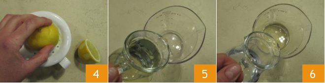 Squeeze the lemon to obtain 100 ml (3.4 oz) of juice 4 and strain it. In a pitcher, pour 315 ml (10.6 oz) of now cold water and sugar syrup 5, 85 ml (2.9 oz) of water 6