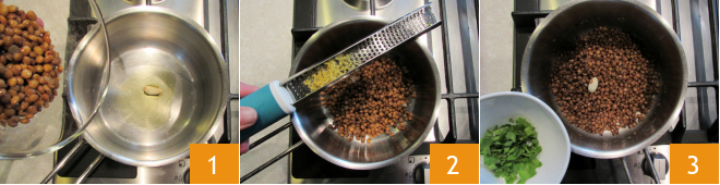 To prepare the lentil and quartirolo salad, start by flavoring the pre-cooked lentils. In a saucepan where you have heated oil and garlic, pour the drained lentils 1. Then add the grated lemon zest, salt and let it simmer on low heat for 5-10 minutes 2. At the end of cooking, turn off the heat and add the finely chopped parsley 3,